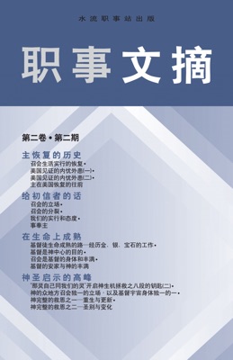 本期我们将继续《职事文摘》第一期(第一卷第一期)所开始之职事的四条路线。第一条线--主恢复的历史--继续李常受文集一九八一年第二册里《历史与启示》系列的第二十一至二十四篇。这几篇说到召会生活实行的恢复、美国见证的内忧外患以及主在美国恢复的往前。第二条线--给初信者的话--继续李常受文集一九五九年第三册中《初信课程》第十六至十九篇。这几篇论到召会的立场、召会的分裂、我们的实行和态度以及事奉主。第三条线--"在生命上成熟"--继续李常受文集一九五五年第三册里"基督徒生命成熟的路"系列《神救恩的目的》第一至三篇,该书包含在李常受文集一九六一年第三册里。《基督徒生命成熟的路》末一章说到,基督徒生命成熟的路--经历金、银、宝石的工作;然后接着开始的一本新书,起头着重说到基督是神中心的目的、召会是基督的身体和丰满以及基督的安家与神的丰满。第四条线--神圣启示的高峰--继续李常受文集一九九四至一九九七年第四册中的《神圣奥秘的范围》末二篇,续论在神圣奥秘范围里所施行之神生机拯救的八方面,神的众地方召会独一的立场,以及基督宇宙身体独一的一;然后开始一本新书--《经历神生机的救恩等于在基督的生命中作王》第一至二篇,说到重生、更新、圣别与变化,该书包含于李常受文集一九九四至一九九七年第五册中。Review: